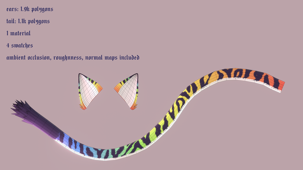 ✦ PBR 4k textures with AO, Roughness, and Normal Maps, including 4 swatches for the tail (Plain, Orange Tiger, White Tiger, Rainbow Tiger)